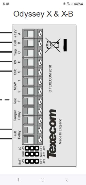 Good evening all. Looking for some help regarding wiring a Texecom Odyssey XB-E bellbox into a very old but working perfectly ADE Optima 2 Plus control panel. Been something like 30 years since I ventured up the ladder to fit the original Flashguard bellbox which has recently failed. I've sourced the aforementioned Texecom bellbox as a replacement and would much appreciate the kind folk on here confirming what I think to be the correct connections between the two as this would hopefully help me avoid making any more than one trip up the ladder to complete the job. (Several trips up the ladder result in much aching of my, these days, not so young legs !) I've included a diagram of the terminals at the bellbox and a picture of the terminals at the control panel. Your help / advice with this small issue would be very much appreciated. Regards, Dave Walton.
