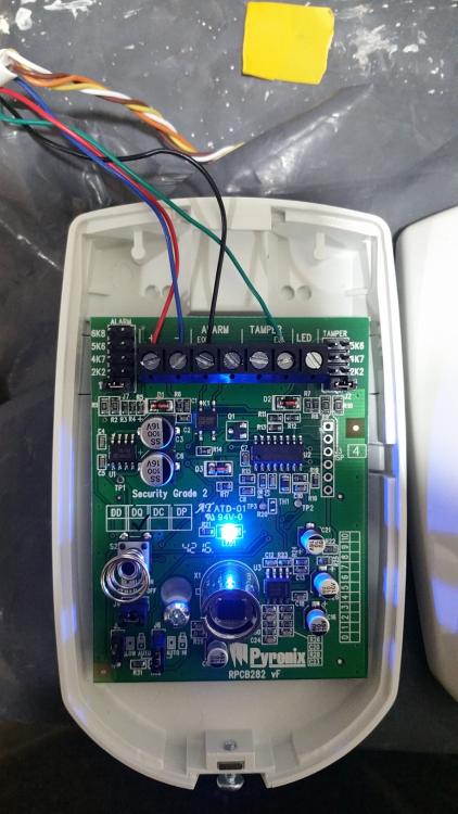 The PX15DQ PIRs have onboard jumpers for selecting resistance values and the Flex's manual says "The default zone configuration is 1 kΩ double-balanced with fault monitoring via a 3 kΩ resistor (preset 11)". The below photo shows my wiring at the PIR end. I've wired the green wire into Zone X and the black wire into the respective ground. I've done something a bit nonstandard with the PIR power wiring. Basically, I'm powering all PIRs via another source. So the + and - connections are wired up to a totally independent power source (naughty or OK?).
