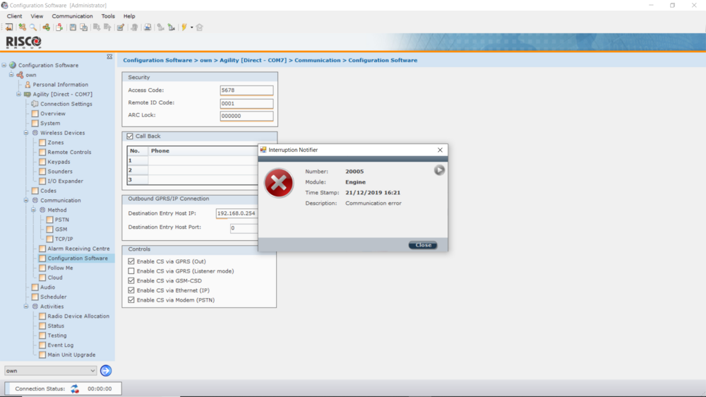 hi i have a problem connecting config software to agility panel rs232 im getting the connection error 20005 any idea why cant connect