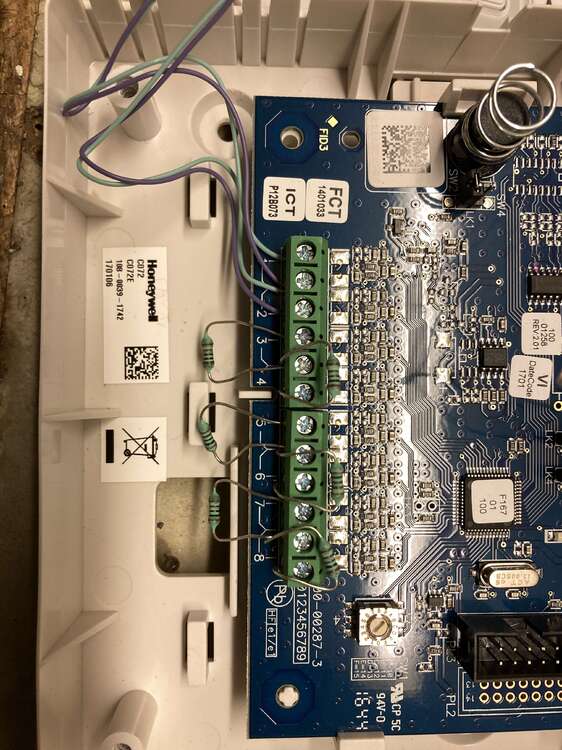 I will attach a short movie on what the display says and a pic on how it looked before I took the old cables away. I put the 1k resistor between 1002 and 0V to the left of 1002. On the film it says (in Swedish): 1003 +SAB.Open circuit IR store floor 1002 +SAB.Short circuit IR store office Not beging an alarm technician guy I just guess that 1001 (that's a door magnet) would have 1=white and 0V=Blue and the 1002 that's an PIR would be connected with 2=purple 0V=green and blue and then the white to 12V on pin 7. IMG_1265.MOV