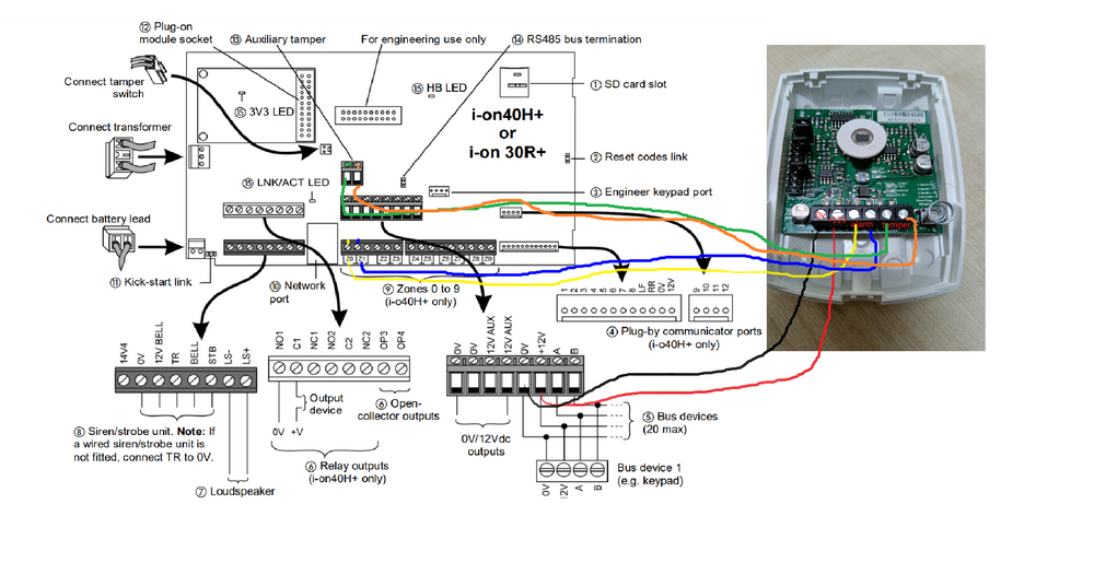 1. Hi all I've just been trying to demo out my predominately wireless ION-40H system. The only part which is wired, is the sounder. Most of the connections have a direct label in the control panel, however, i'm getting confused over the ENG input which appears on my siren. The manual says, output of type "installer on Site". However, i cannot locate a relevant connection on my control panel I've attached manual screenshots of both the bell inputs and my control panel diagram. Any advice is much appreciated. Thank you
