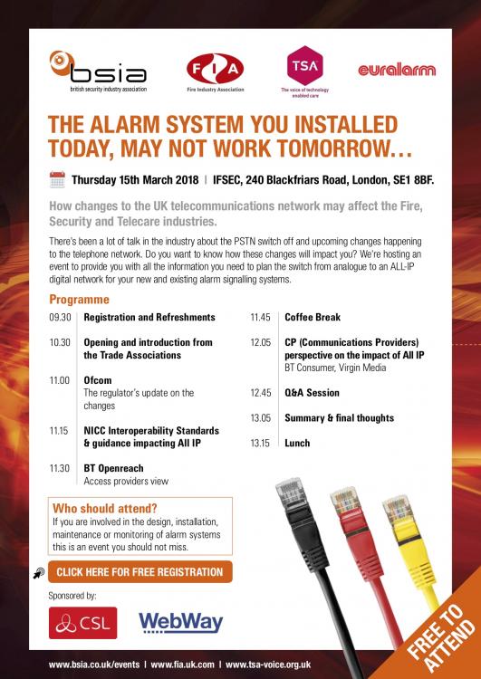 BSIA are hosting an event at the UBM office on the 15th March, in London, to discuss the migration to ALL IP. It is a free to attend event with speakers from Offcom, BT Openreach, BT Consumer and Virgin Media. Flyer attached.